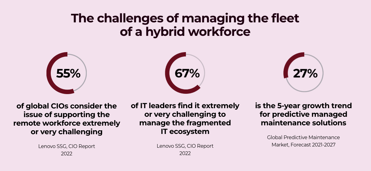 Digital workplace. Hybrid workplace. Transformed workplace. Whatever label we put on it, keeping your device fleet optimised and your internal customers happy and productive is a huge challenge! Adding the adoption of new IT solutions, the use of remote personal devices and the need to speed up digital transformation increases the pressure on IT leaders, executives, and their teams.